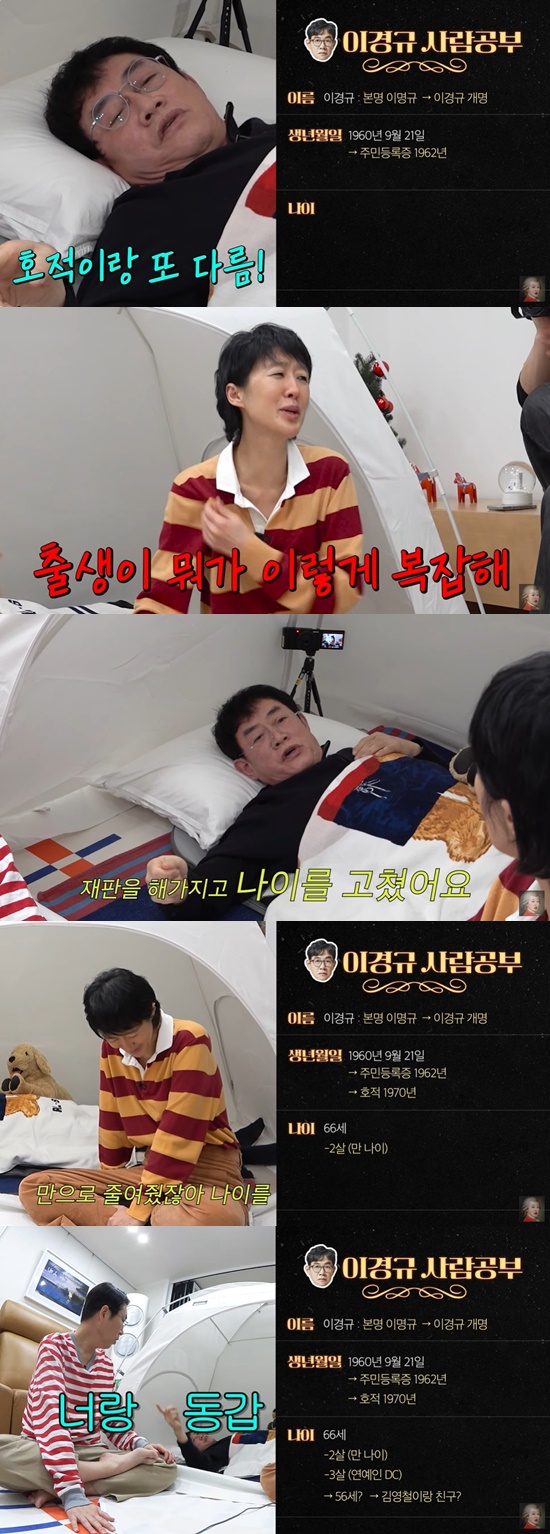 이경규는 "그래가지고 재판을 해가지고 나이를 고쳤다. 저게 나이를 한 번에 많이 못 줄이게 되어있다. 그러다보니까 1960년까지 못 줄였다"고 고백했다.