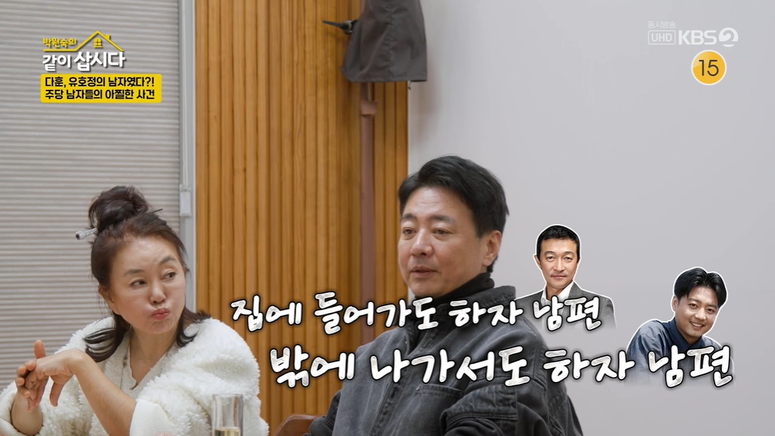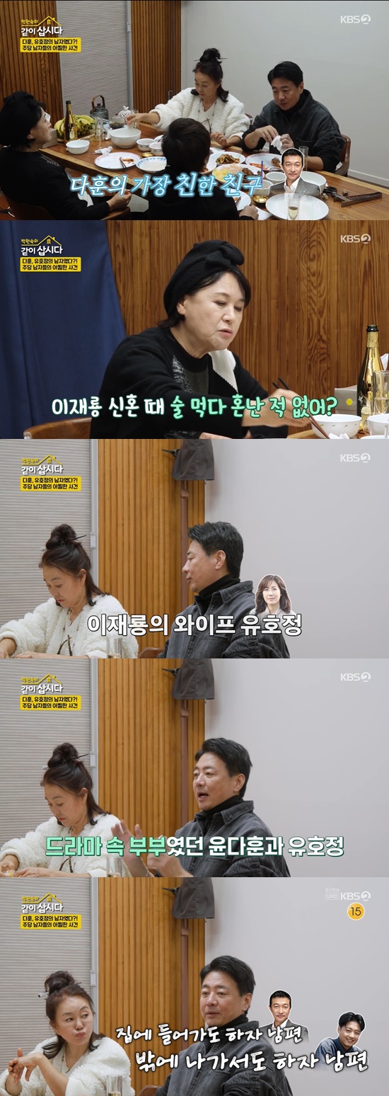 반면 윤다훈은 술 친구가 많다며 배우 이재룡을 언급했다. 박원숙은 "이재룡 신혼 때 술 먹다 혼난 적 없냐"고 물었고, 윤다훈은 "이재룡 씨 아내가 유호정 씨인데, 드라마에서 저랑 부부로 나왔다. 항상 보면 '집에 들어가면 하자 남편, 밖에 나와서도 하자 남편'이라고 했다. 둘 다 만나면 똑같이 술을 먹으니까 똑같은 냄새가 난 것"이라고 이야기했다.