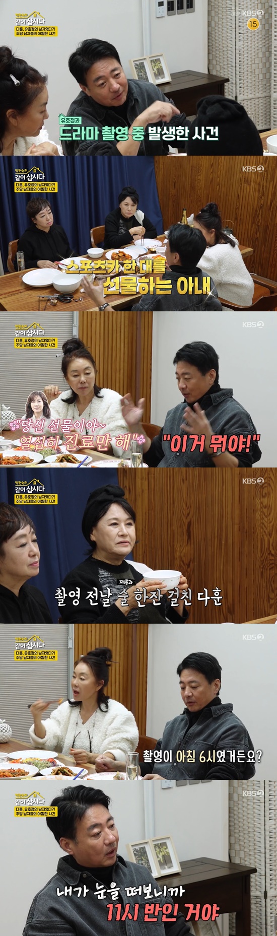유호정과 드라마를 촬영할 당시 간단한 신의 촬영을 앞두고 전날 술을 마셨다는 윤다훈은 "촬영이 분당에서 아침 6시에 있었다. 6시에 스탠바이해서 촬영 들어가는 거였는데, 아침에 일어나보니 11시 반이더라"고 말해 모두를 경악케 했다.