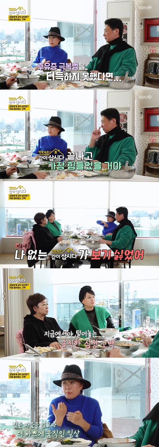그는 "함께 산다는 것을 경험하다 보니 상대를 이해하는 마음이 생겼다. 무남독녀 외동딸로서 뭘 알겠나. 그런데다가 '내가 잘 해가지고 언니들한테 본 때를 보여줘야지, 잘해야지' 하는 생각이 있었다"고 이야기했고, 박원숙은 "얘가 솔직해졌네. 예전 같으면 그런 게 있어도 아닌 척 하고 있는데, 많이 성숙해졌다"고 흡족해했다.