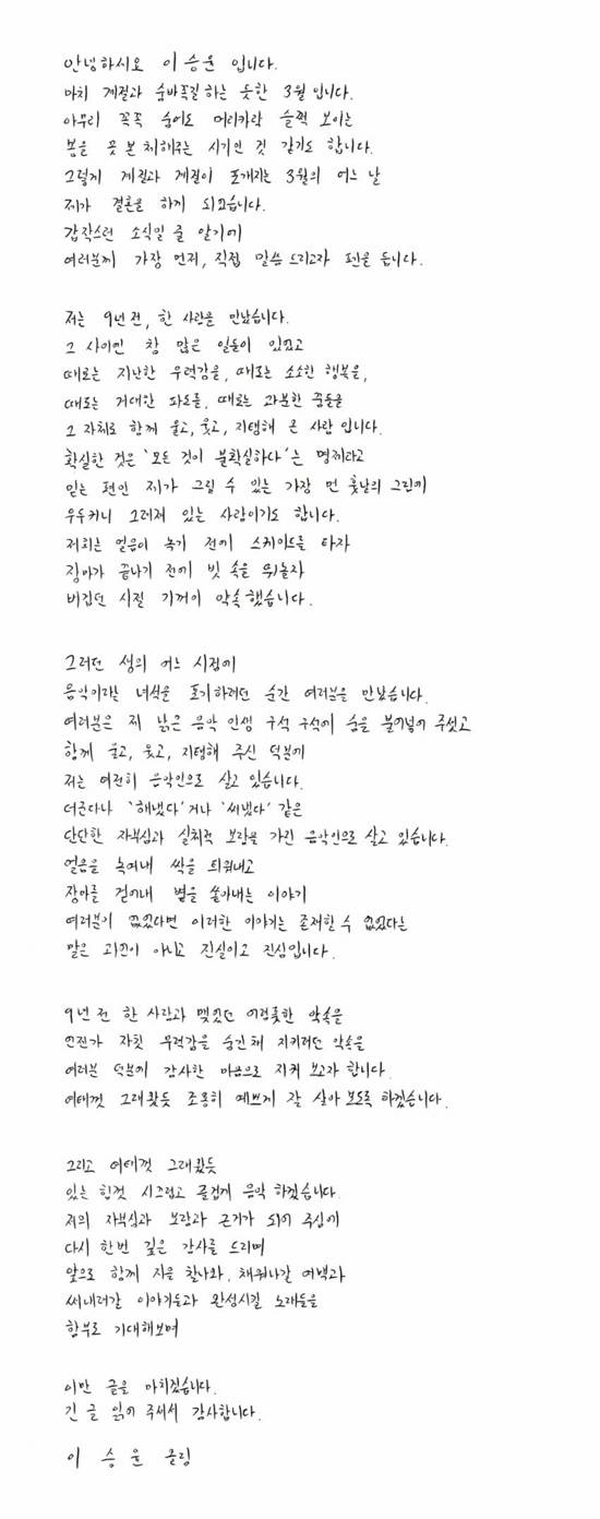 그는 "9년 전 한 사람과 맺었던 어렴풋한 약속을, 언젠가 자칫 무력함을 숨긴 채 지키려던 약속을 덕분에 감사한 마음으로 지켜보고자 합니다. 여태껏 그래왔듯 조용히 예쁘게 잘살아 보도록 하겠습니다"라고 덧붙였다.