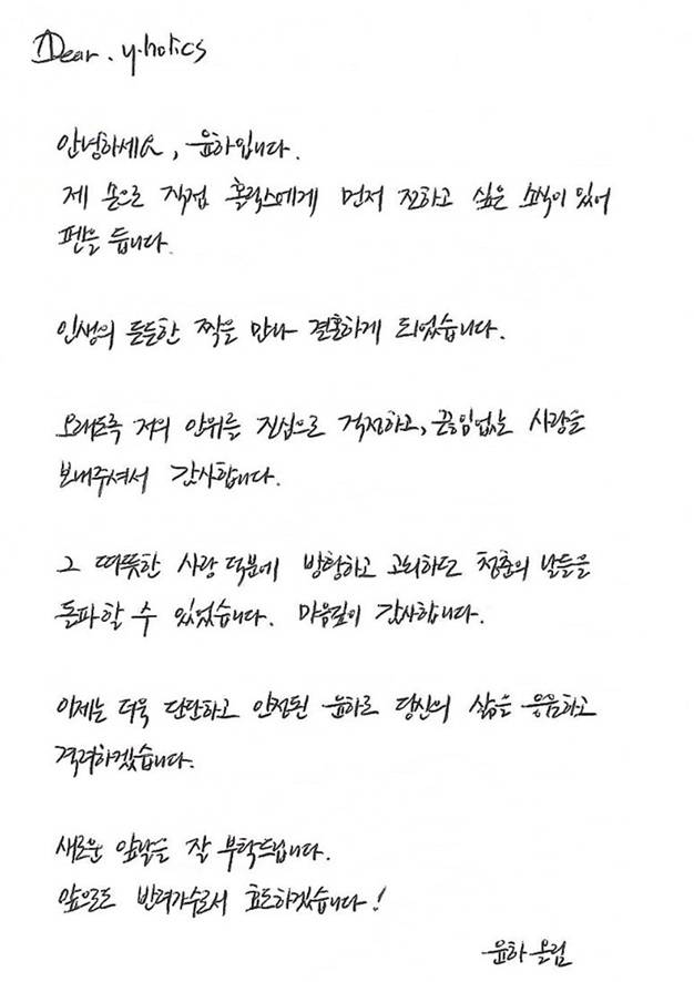 또한 "이제는 더욱 단단하고 안정된 윤하로 당신의 삶을 응원하고 격려하겠다"며 "새로운 앞날을 잘 부탁드립니다. 앞으로도 반려가수로서 효도하겠다"고 덧붙였다.