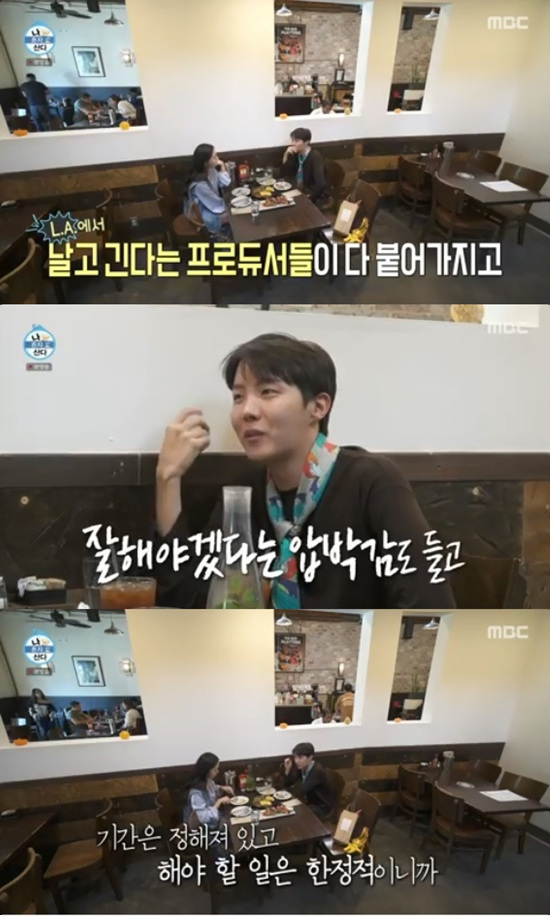 제이홉은 "LA에서 날고 긴다는 프로듀서들이 다 붙었는데 잘해야겠다는 압박감이 있다. 기간은 정해져 있고 할 일은 한정적이니까 부담이 되는 거다"라고 전했다.