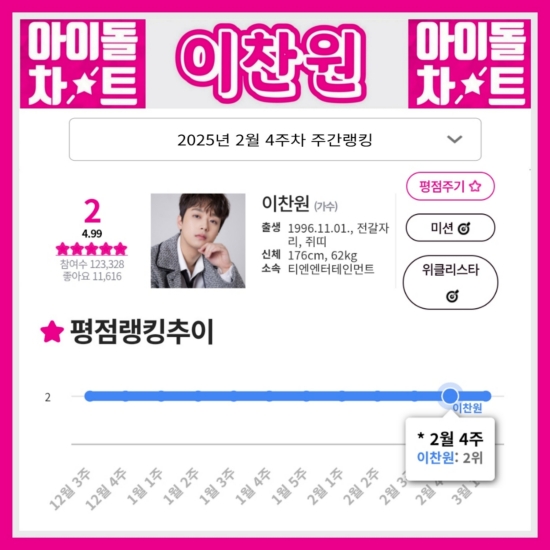 아이돌차트는 최근 이찬원이 2025년 2월 4주 차 평점 랭킹에서 123,328표를 받아 2위를 차지했다고 밝혔다.