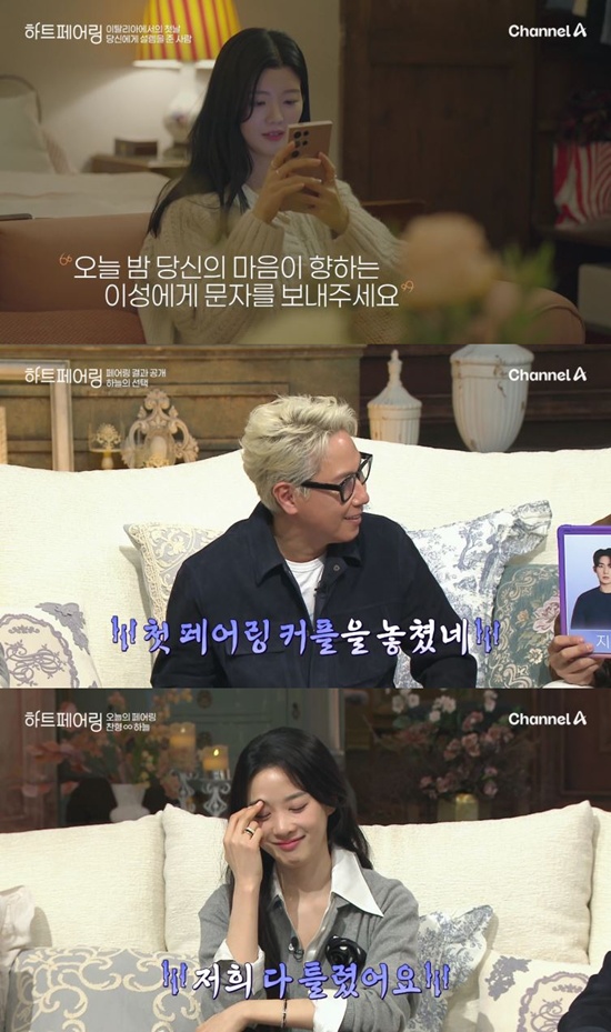 잠시 후, ‘첫 페어링’ 결과가 공개됐는데, '제연→우재, 우재→지원, 지원→지민, 지민→제연, 찬형→하늘, 하늘→찬형'으로 밝혀져 5MC를 멘붕에 빠뜨렸다. '찬형X하늘'만 '페어링'에 성공한 가운데, '인기남' 지민이 지원이 아닌 제연을 선택했다는 사실에 충격을 받은 최시원은 "종신이 형을 이제 못 믿겠다"며 '하트시그널' 경력 9년 차인 윤종신에 대해 불신을 드러냈다. 윤종신 역시 "날 믿지 말라"고 빠르게 인정해 현장을 뒤집어놨다.