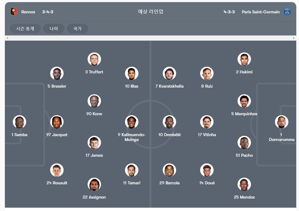 빅데이터를 기반으로 하는 축구 통계 전문 매체 '풋몹' 역시 예상 라인업에 이강인의 이름을 뺐다. 이강인이 뛸 수 있는 미드필드 자리에는 두에, 비티냐, 파비안 루이스가 이름을 올렸다.