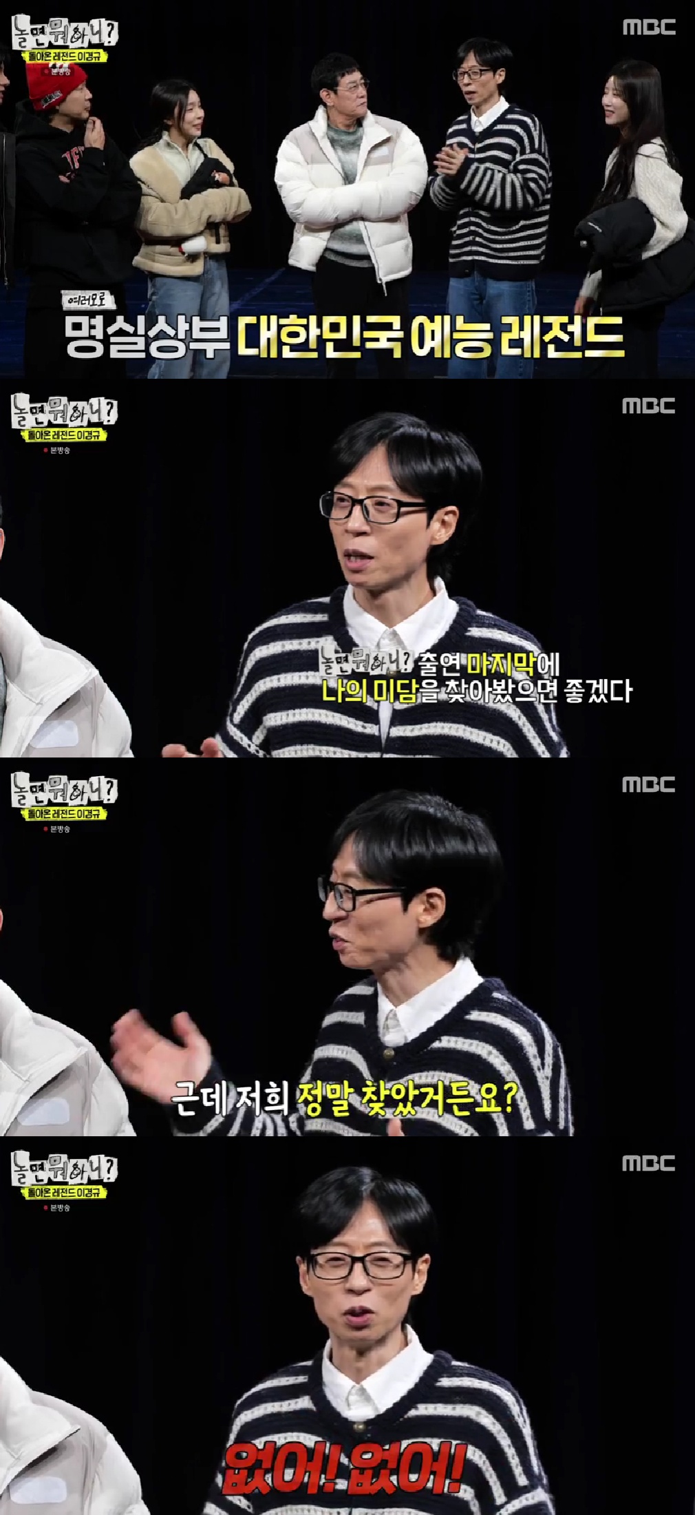 주우재는 "대상 8개 있는 유재석"라고 덧붙였고, 유재석은 "저는 MBC 레전드라고 보기에는..."라며 MBC 레전드를 부인했다. 45년 차 예능 대부 이경규가 등장하자 유재석은 "경규 형이 대한민국 예능에서 레전드다"며 이경규를 향한 존경심을 표했다.
