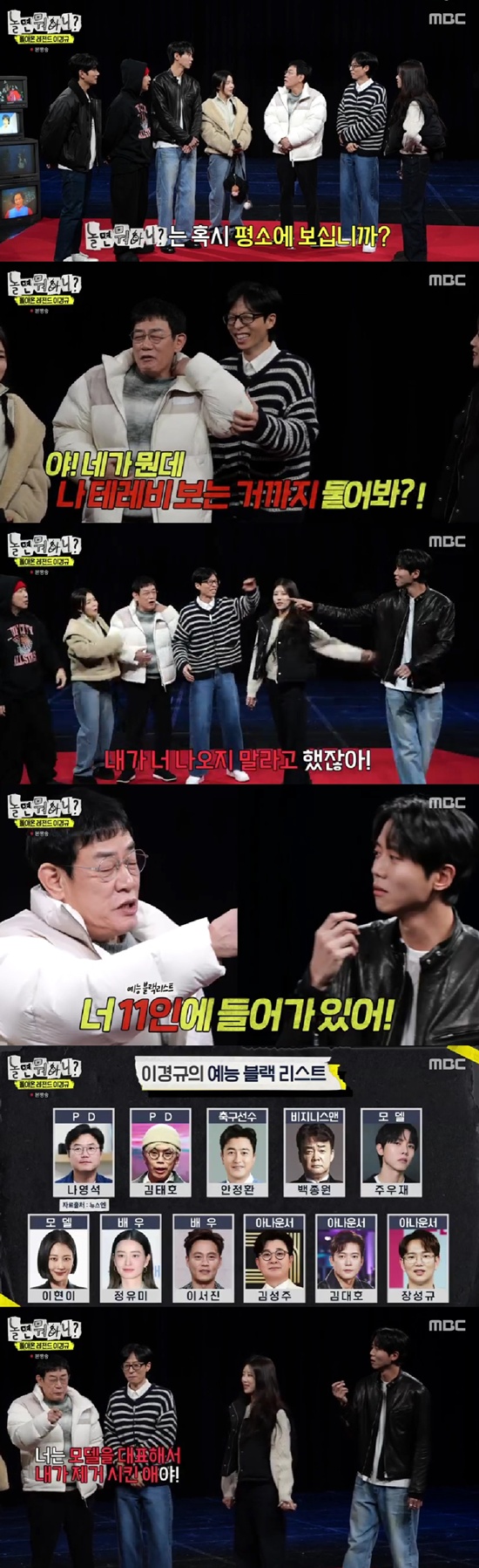 주우재는 "'놀면 뭐하니?'는 평소에 보시냐"고 질문을 던졌고, 이경규는 "뭐? 네가 뭔데 나 TV 보는 것까지 물어봐"며 발끈하더니 "내가 너 나오지 말라고 했잖아. 너 (예능 블랙리스트) 11인에 들어가 있다"고 자신이 만든 예능 블랙리스트를 언급했다.