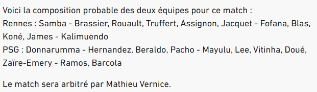 실제로 현지 매체들은 1차전에서 좋은 모습을 보였던 흐비차 크바라츠헬리아와 에이스 우스만 뎀벨레의 결장을 예상하고 있다. 주전 선수들에게 휴식을 부여하고 비주전 선수들을 렌과의 경기에 내보내겠다는 것으로 해석할 수밖에 없다.