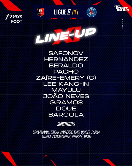 원정팀 PSG는 4-3-3 전형으로 맞섰다. 마트베이 사포노프 골키퍼를 비롯해 뤼카 에르난데스, 윌리안 파쵸, 베랄두, 워렌 자이르-에메리가 수비를 구성했다. 세니 마율루, 주앙 네베스, 데지레 두에가 중원을 지켰다. 측면에 브래들리 바르콜라, 이강인, 최전방에 곤살루 하무스가 출격했다.