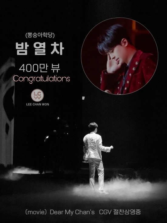 한편, 이찬원은 전국 투어 콘서트 실황 영화 '찬가: 디어 마이 찬스'를 통해 팬들과 만나고 있다.