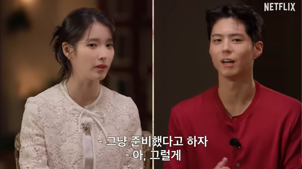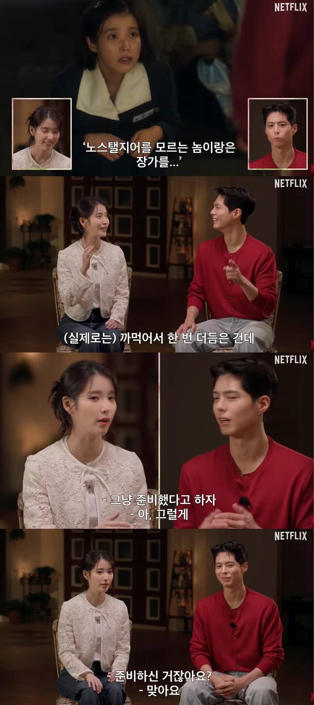 이에 아이유는 "스태프분들 다 빵 터지지 않았냐. 까먹어서 한번 더듬은 건데 우리는 모두가 다 준비한 줄 알았다. 너무 재밌어서"라고 말했다. 박보검은 "그럼 그냥 준비했다고 할까?"라고 했고, 아이유는 "준비하신 거잖아요?"리며 능청스럽게 질문했다. 박보검은 "맞아요"라고 받아쳤다.