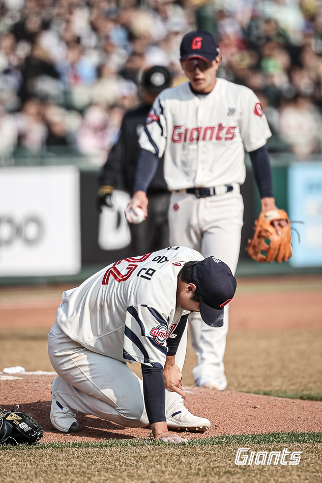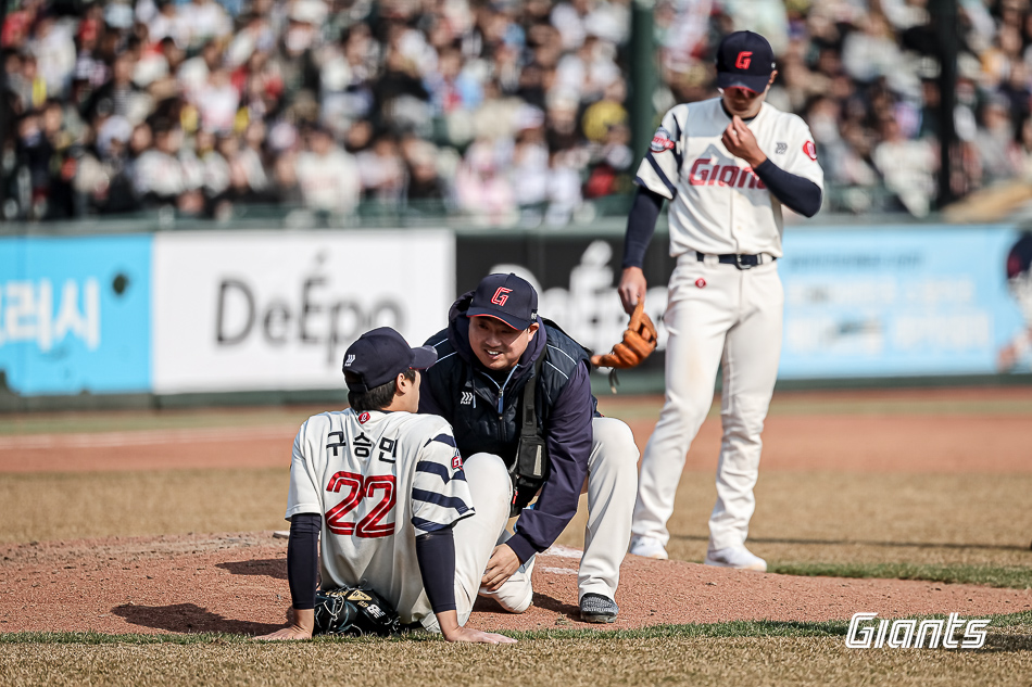 김규성이 투수 강습 내야 안타로 출루한 가운데 구승민은 왼쪽 정강이를 붙잡고 쓰러졌다. 롯데 트레이닝 파트와 주형광 1군 메인 투수코치가 긴급히 마운드를 방문, 구승민의 상태를 살폈다.