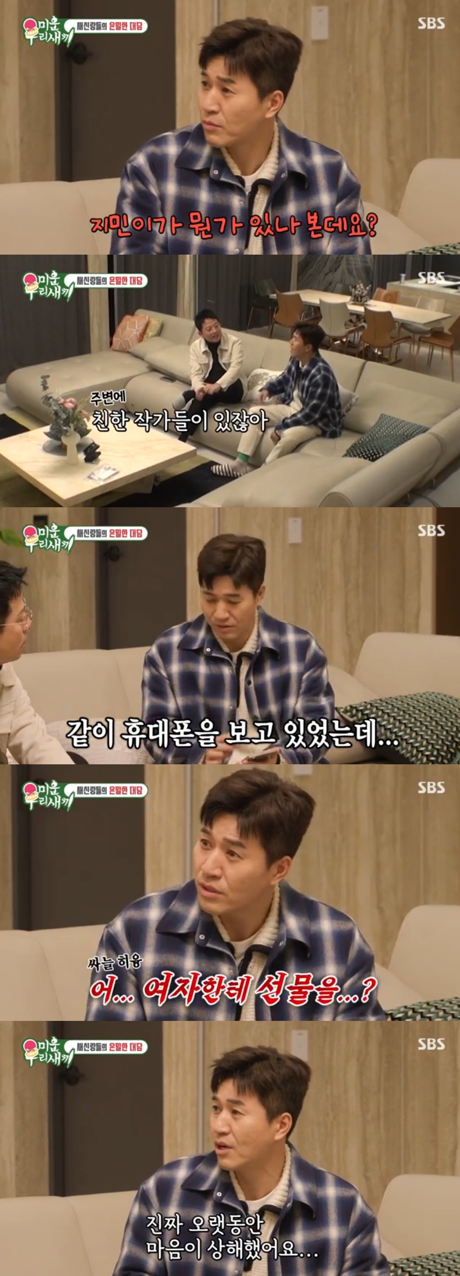 김종민은 "아니라고 막 했다. 이거 때문에 오랫동안 마음이 상해있었다. 다신 안 한다고, 어느 누구에게도 선물 안 한다고 했다. 보면 마음 상할 만 하더라. 아무것도 아닌데"라고 이야기했다.