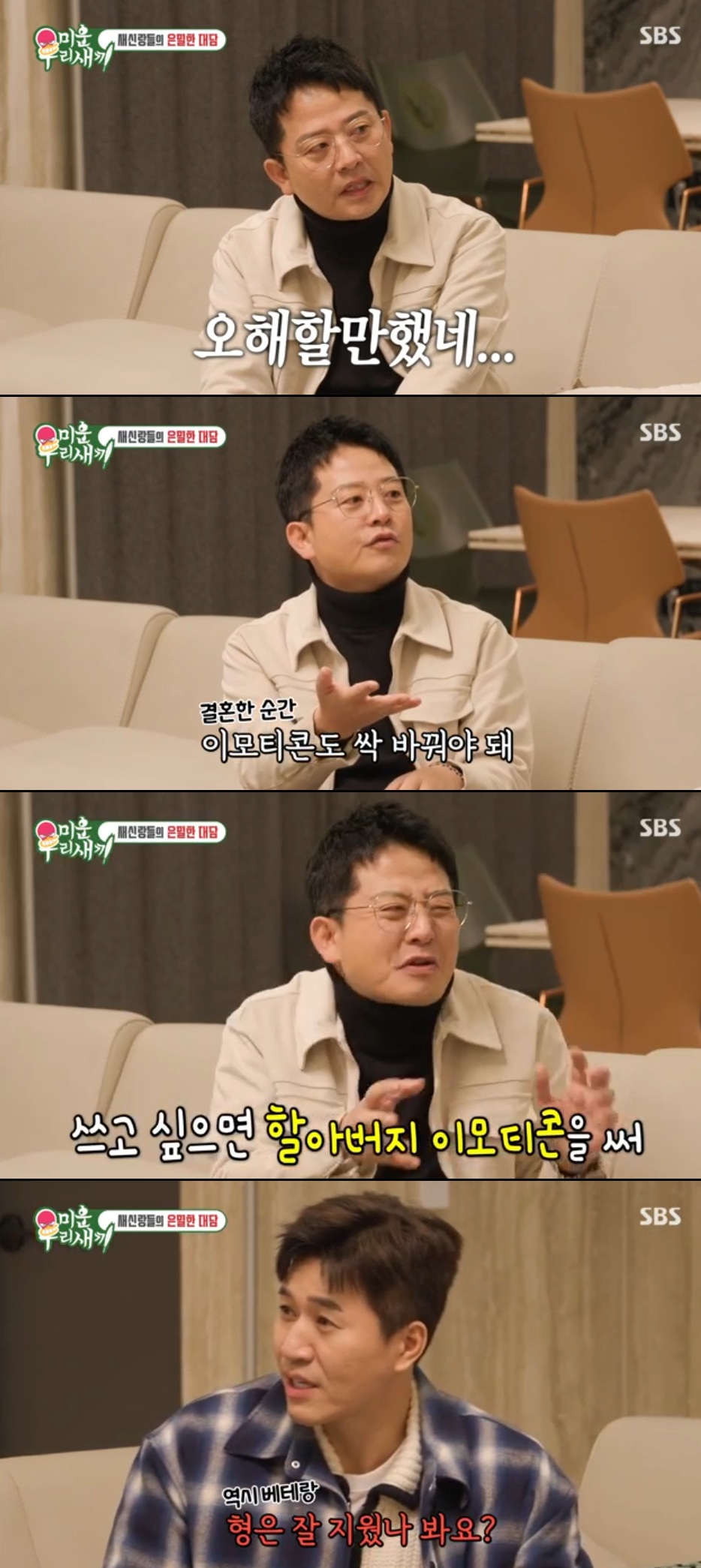 이를 들은 김준호는 "이모티콘도 싹 결혼하는 순간 바꿔야 한다"며 "아예 말도 안 되는 할아버지 이모티콘 같은 걸 써라"라고 조언했다.