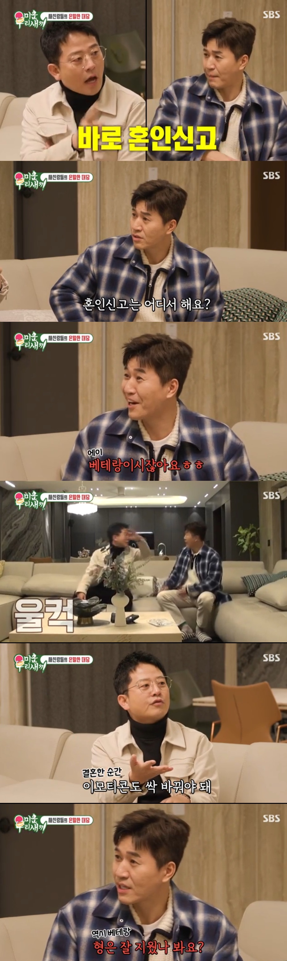 김종민은 "형 근데 혼인신고 어디서 하냐"고 물었고 김준호는 "그걸 왜 나에게 묻냐"며 황당해했다.