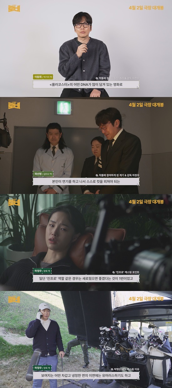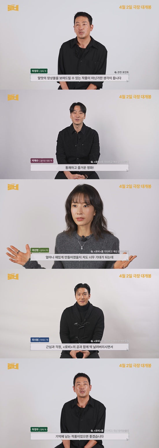 또 골프장 대표 사모님 다미 역의 차주영은 "하정우 표 코미디를 좋아하던 팬으로서 (이번 작품에) 참여하고 싶었다"고 전했고, 로비 알선 기자 박기자 역을 맡은 이동휘는 "'로비'는 감독님의 전작인 '롤러코스터'의 DNA가 담겨 있는 작품이다. 감독님은 저의 상태와 저의 어떤 방향성, 다음 스텝까지도 다 내다보고 계셨다"라며 연출가 하정우에 대한 남다른 팬심을 드러내며 협업한 소감을 전함은 물론, 전작에 이어 독특한 발상으로 작품을 구상한 하정우 표 코미디에 대한 기대감을 끌어올렸다.