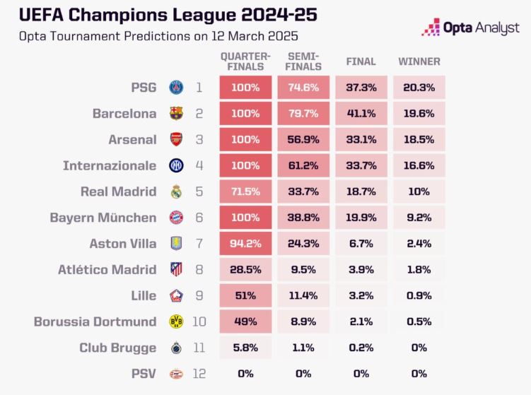 기존에 우승 가능성이 가장 높았던 리버풀(23.9%)이 탈락함에 따라, PSG의 우승 확률은 20.3%로 급상승했다. 이는 2위 바르셀로나(19.6%), 3위 아스널(18.5%)보다 근소 우위인 수치다.