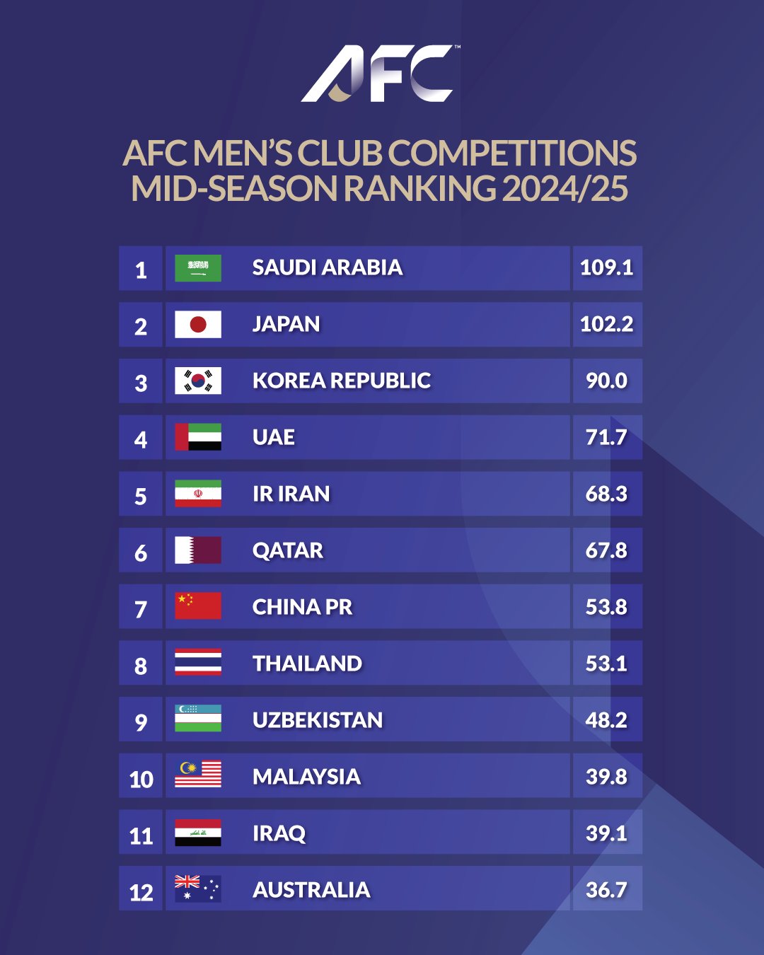 AFC 남자 클럽 랭킹은 최근 8개년 국가 점수에 가장 최근 시즌 점수에 높은 가중치를 둬 합산 점수를 계산한단. 이번 시즌 점수가 1배이면, 가장 먼 시즌인 2016시즌 점수는 0.3배다. 특히 중국이 코로나로 인해 2021시즌과 2022시즌 점수가 0점대에 그치면서 태국과 격차가 좁혀졌고 올 시즌 점수 격차가 벌어지면서 순위가 역전됐다.