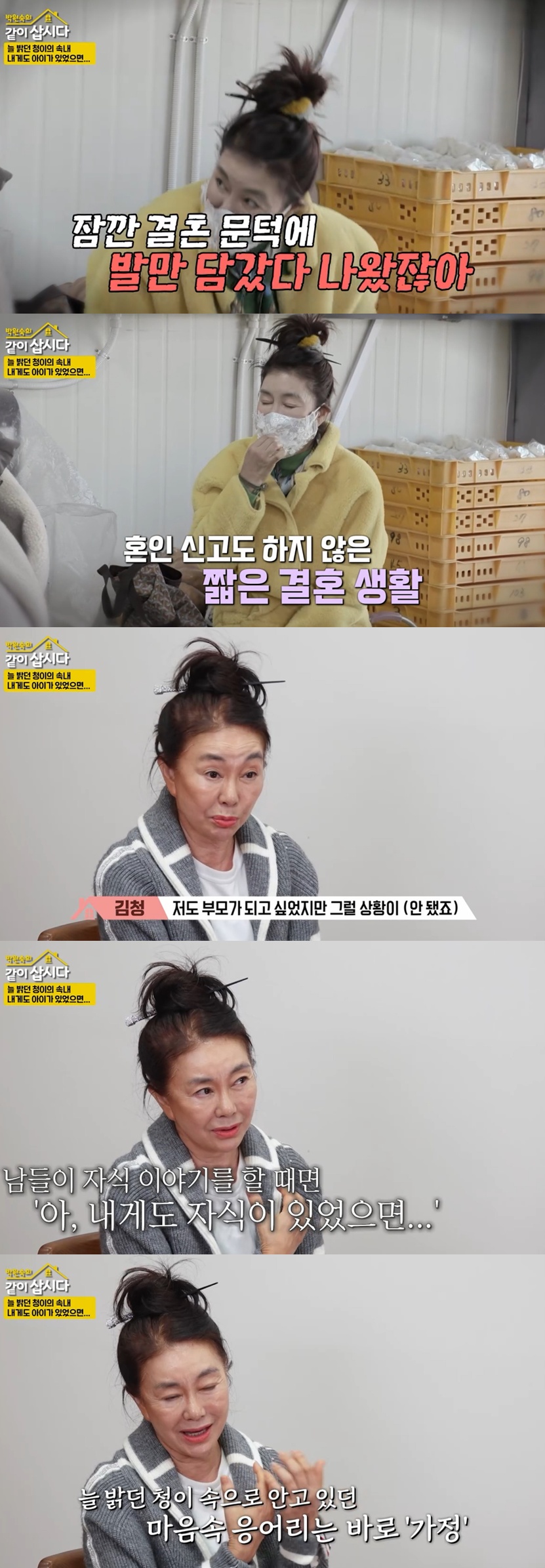 마음의 상처로 한동안 칩거 생활을 했다고 고백한 김청은 "진짜 아팠다. 저도 부모가 되고 싶었지만 그럴 상황이 (안 됐다)"며 "(남들이) 자식 얘기 할 때는 스스로 '나도 자식이 있었으면' 라는 생각이 든다. 저한테는 아픈 스토리"라며 가정에 대한 응어리를 솔직하게 털어놓았다.