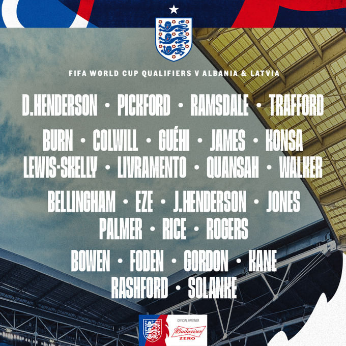 잉글랜드축구협회는 14일(한국시간) 3월 알바니아, 라트비아와의 2026 국제축구연맹(FIFA) 북중미 월드컵 유럽 지역 예선에 나설 선수 명단을 공개했다.