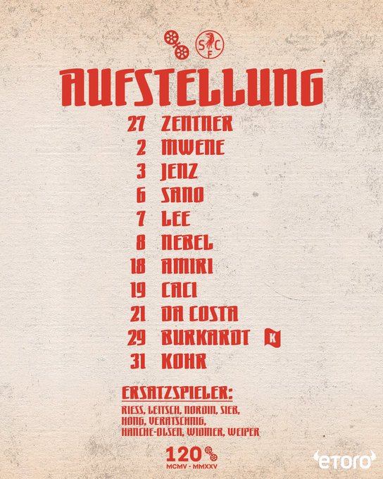 이에 맞서는 원정팀 프라이부르크는 4-4-1-1 전형을 내세웠다. 노아 아투불루가 골키퍼 장갑을 꼈고, 크리스티안 귄터, 마티아스 긴터, 필리프 린하르트, 킬리안 실릴리아가 백4를 구성했다. 미드필드에는 빈첸초 그리포, 파트리크 오스테르하게, 막시밀리안 에게슈타인아다무, 도안 리쓰가 배치됐다. 2선에는 루카스 횔러가, 최전방 원톱에는 추쿠부이케 아다무가 선발 출전했다.