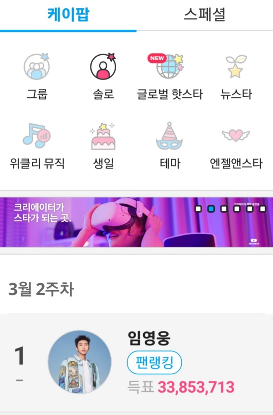 최근 '팬앤스타'에 따르면, 임영웅은 3월 2주 차 솔로가수 인기 랭킹 투표에서 1위에 등극했다.