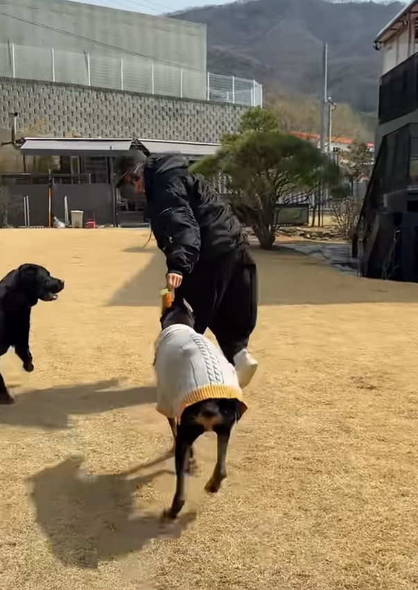 영상에는 야외 공간에서 '삑삑이' 장난감을 가지고 놀고 있는 반려견 벨과 배정남의 모습이 담겼다.
