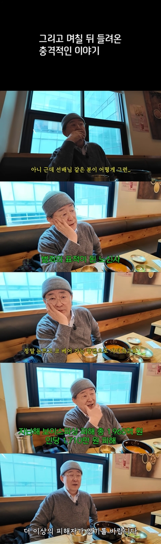 제작진은 자막을 통해 "지난해 보이스피싱 피해 총 1,965억 원, 인당 1,710만 원 피해. 특히 디지털 매체에 익숙하지 않은 60대 이상 피해가 빠르게 늘고 있다"며 "본 영상은 더 이상 노령자 피해를 줄이는 데 조금이라도 도움이 되고자 출연자와 깊은 상의 끝에 용기 내 공개한다"고 전했다.