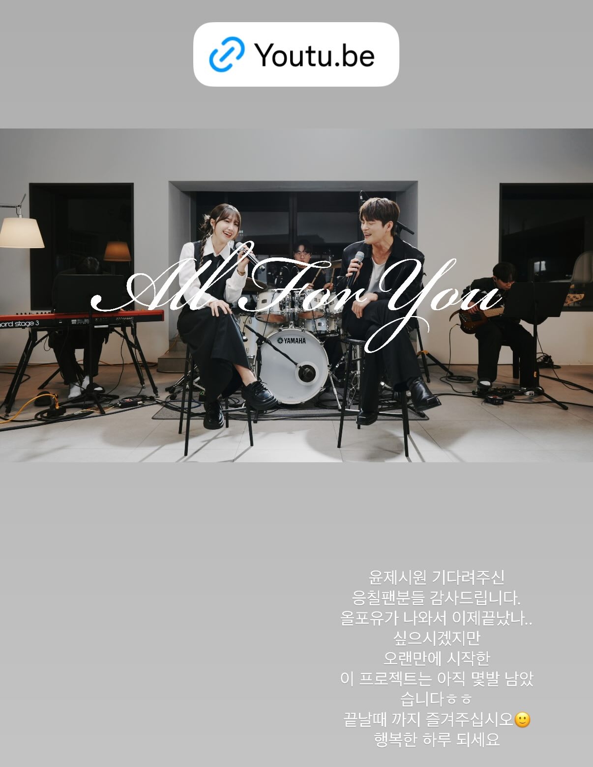 이에 대중들은 "13시 13분에 올라온 올포유 그리고 윤제시원 13주년 정말 축하합니다", "팬들이 진짜 좋아할 것들을 계속 준비하고 해준 것 같아 마음이 따듯하다", "각자 콘서트에서 부르는 것만 보다가 드디어", "같은 노랜데 뭔가 성숙함이 묻어난다"며 뜨거운 반응을 보였다.