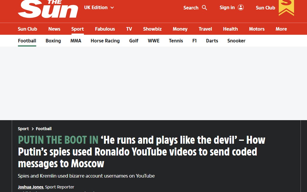 영국 매체 '더 선'은 18일(한국시간) "푸틴의 스파이가 호날두 유튜브 동영상을 이용해 모스크바에 암호화된 메시지를 보냈다"라고 보도했다.