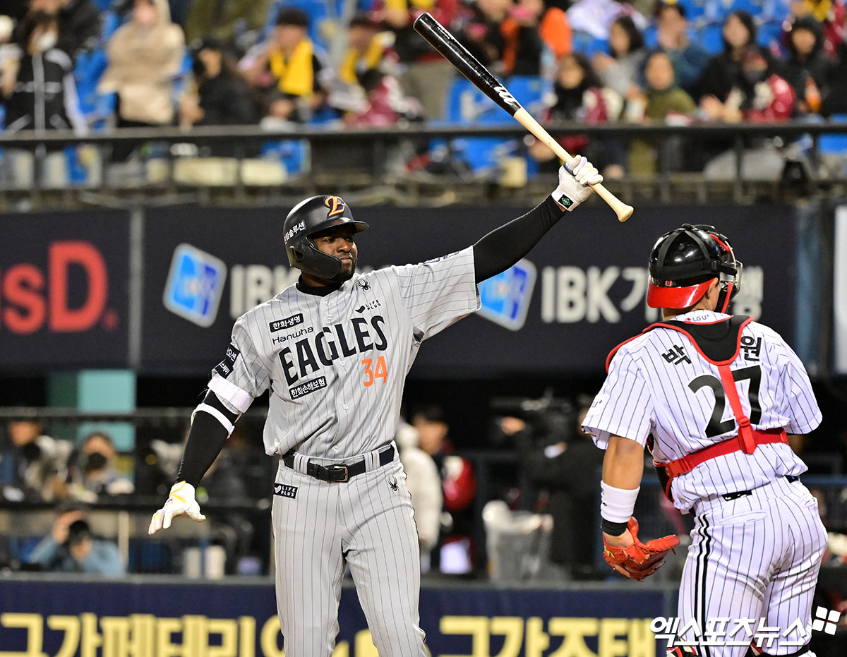 (엑스포츠뉴스 잠실, 김한준 기자) 25일 오후 서울 송파구 잠실야구장에서 열린 '2025 신한 SOL Bank KBO리그' 한화 이글스와 LG 트윈스의 경기, 4회초 무사 1루 한화 플로리얼이 헛스윙 삼진을 당하고 있다.