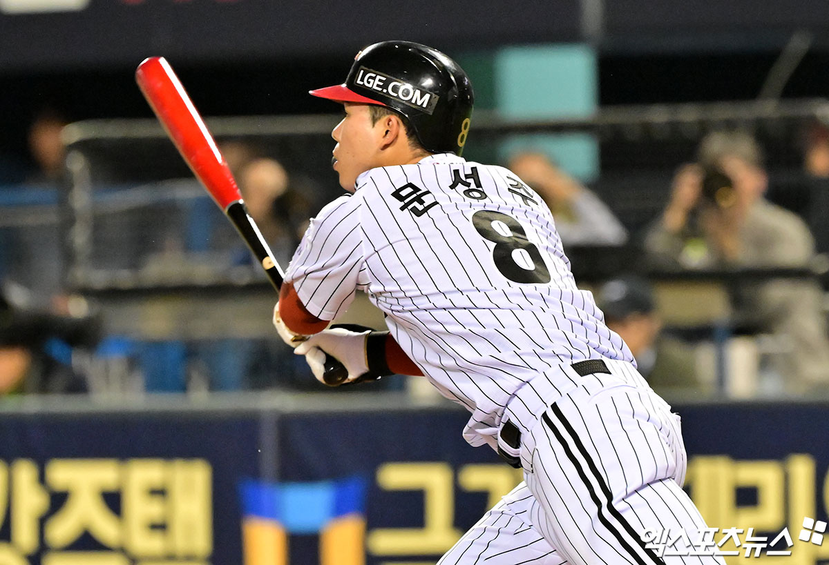 (엑스포츠뉴스 잠실, 김한준 기자) 26일 오후 서울 송파구 잠실야구장에서 열린 '2025 신한 SOL Bank KBO리그' 한화 이글스와 LG 트윈스의 경기, 5회말 무사 1루 LG 문성주가 타격을 하고 있다. 결과는 우익수 플라이 아웃.