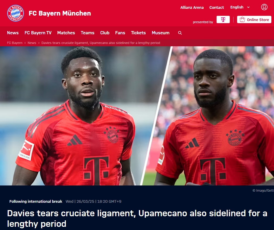 구단은 "뮌헨은 A매치 기간 후 긴 시간 데이비스 없이 있을 것이다. 우파메카노도 몇 주간 빠진다"면서 "데이비스는 캐나다 축구 대표팀에서 A매치 일정을 소화한 뒤 돌아와서 오른쪽 무릎 십자인대 부상을 당했고 이날 수술을 받을 것이다. 그는 몇 달간 뛰지 못할 것"이라고 알렸다.