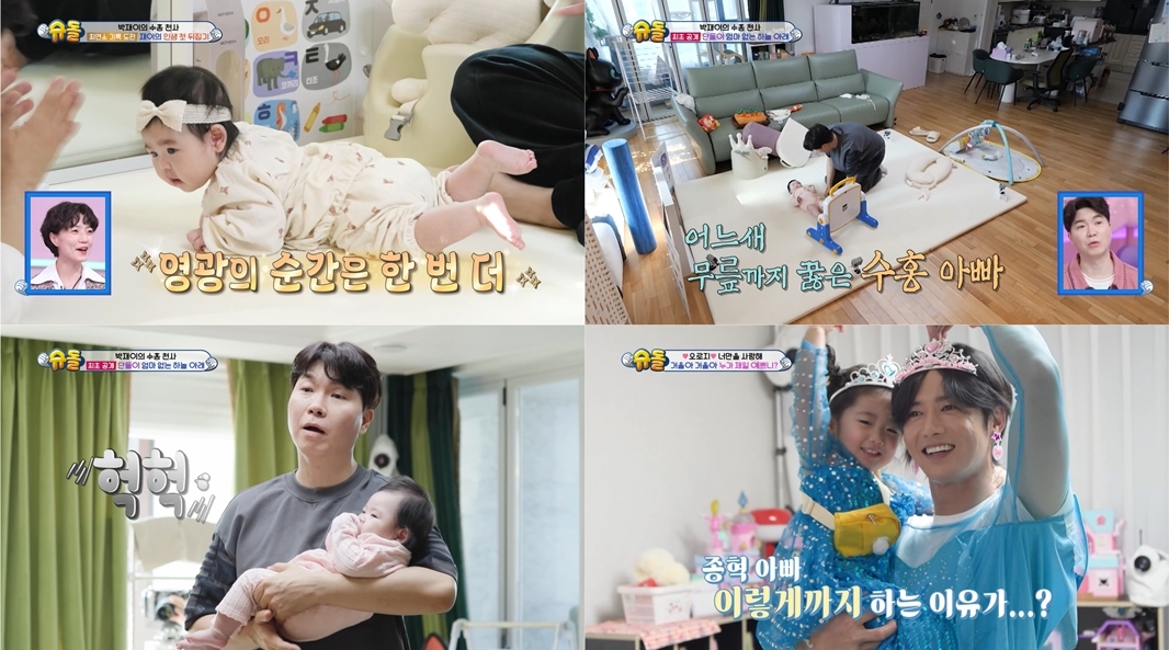 또한 박수홍은 재이 앞에서 저절로 무릎을 꿇게 된다고 자백했다. 그는 "나도 모르게 공주님 모시듯 하게 된다"라며 딸에 대해 각별한 애정을 드러냈다. 박수홍은 재이가 잠든 후에도 집안일하고, 기상한 재이에게 분유를 먹여주는 등 끝나지 않는 육아의 굴레에 빠졌다.