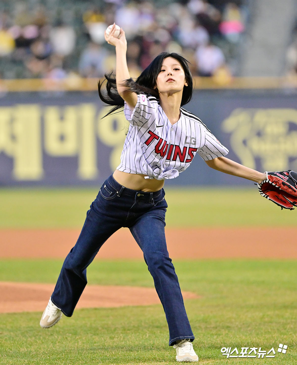 (엑스포츠뉴스 잠실, 김한준 기자) 27일 오후 서울 송파구 잠실야구장에서 열린 '2025 신한 SOL Bank KBO리그' 한화 이글스와 LG 트윈스의 경기, 경기 전 있지 예지가 시구에 임하고 있다.