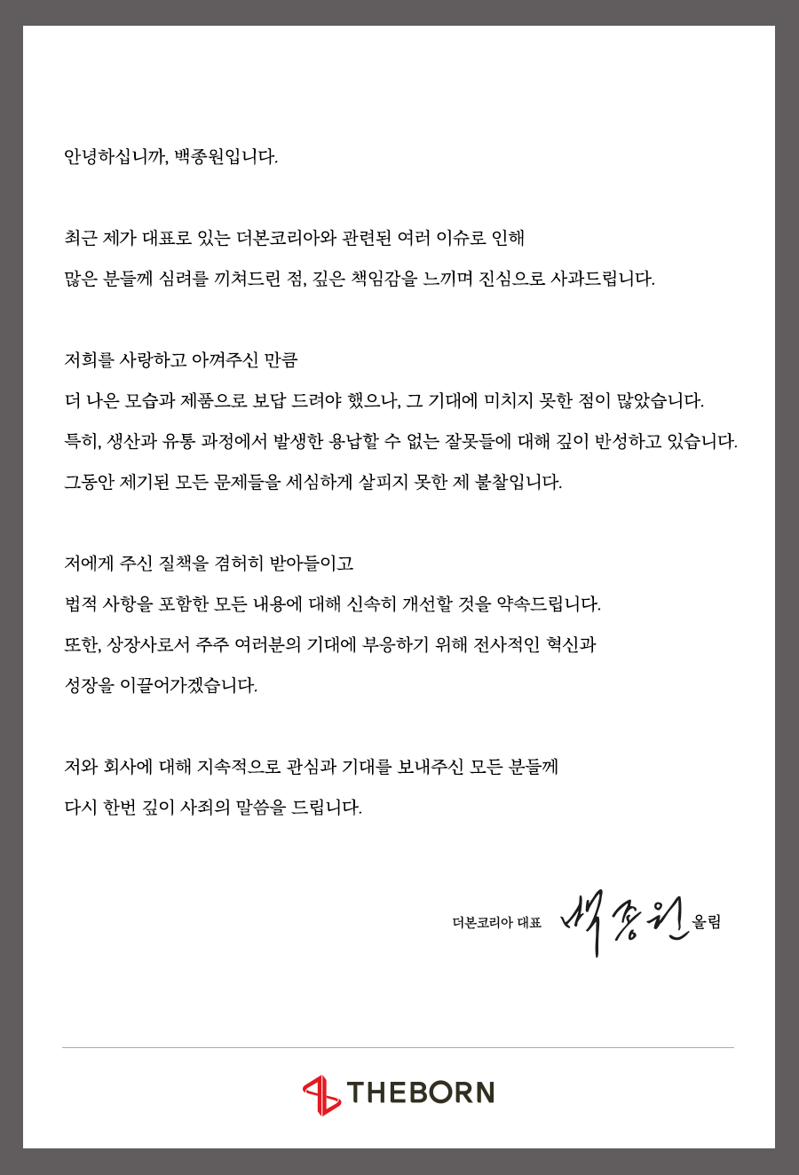 이어 "생산과 유통 과정에서 발생한 용납할 수 없는 잘못들에 대해 깊이 반성하고 있다"며 "질책을 겸허히 받아들이고 법적 사항을 포함한 모든 내용에 대해 신속히 개선할 것을 약속드린다"고 덧붙였다.