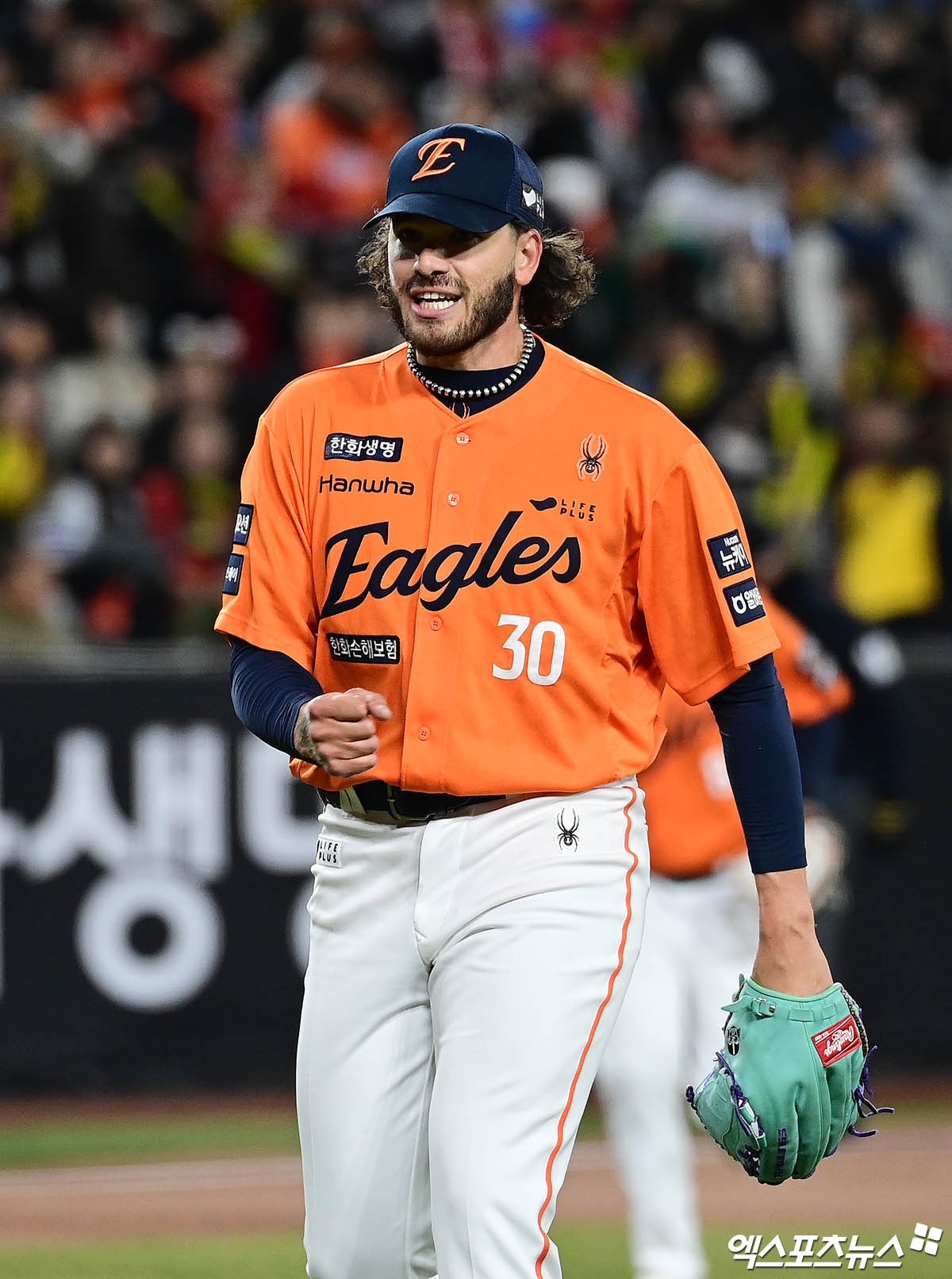 (엑스포츠뉴스 대전, 박지영 기자) 28일 오후 대전한화생명볼파크에서 열린 '2025 신한 SOL Bank KBO리그' 한화 이글스와 KIA 타이거즈의 경기, 3회초 종료 후 한화 선발투수 폰세가 환호하고 있다.