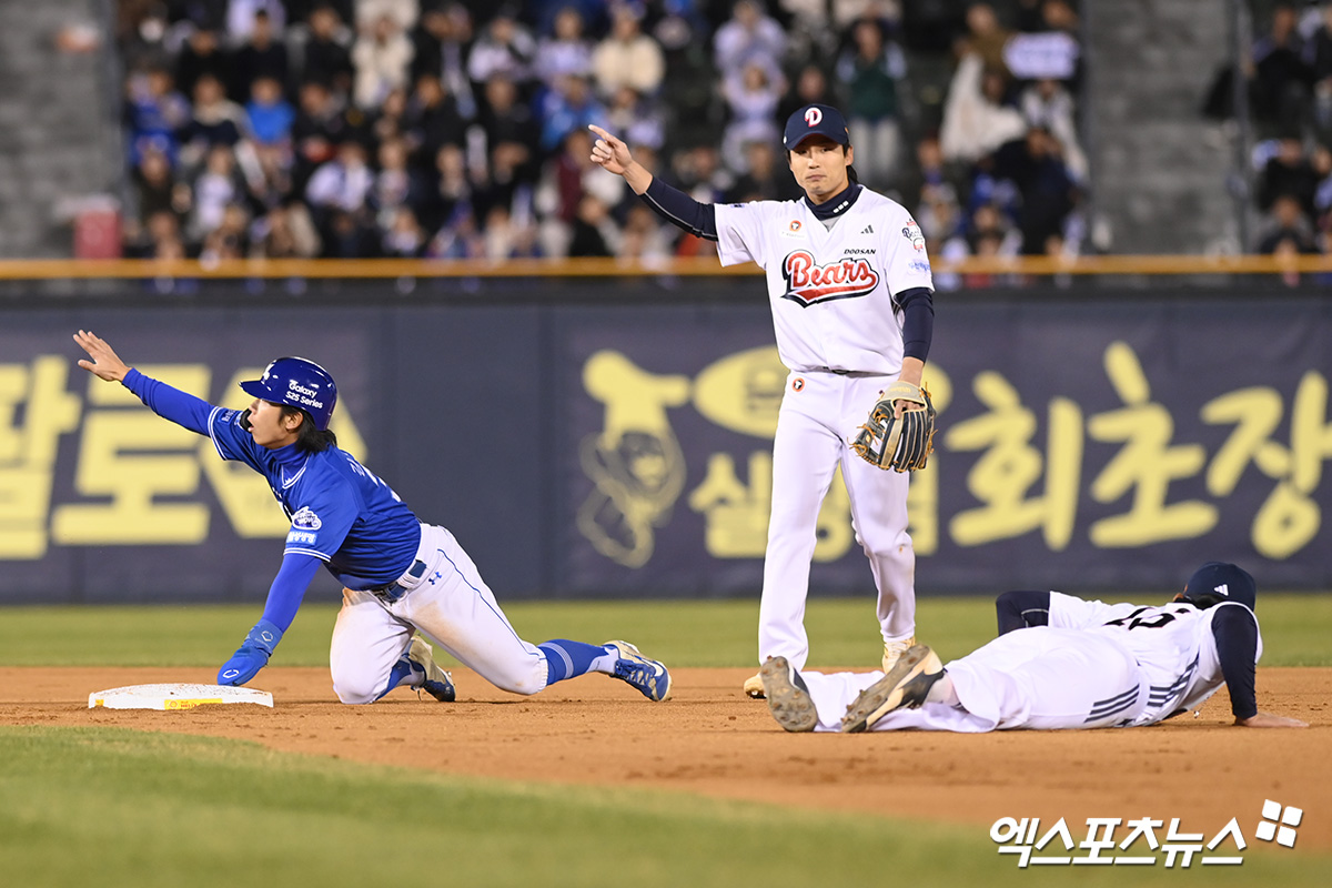 (엑스포츠뉴스 잠실, 고아라 기자) 28일 오후 서울 송파구 잠실야구장에서 열린 '2025 신한 SOL Bank KBO리그' 삼성 라이온즈와 두산 베어스의 경기, 8회초 무사 1루 삼성 김성윤이 2루 도루를 시도했지만 아웃되고 있다.