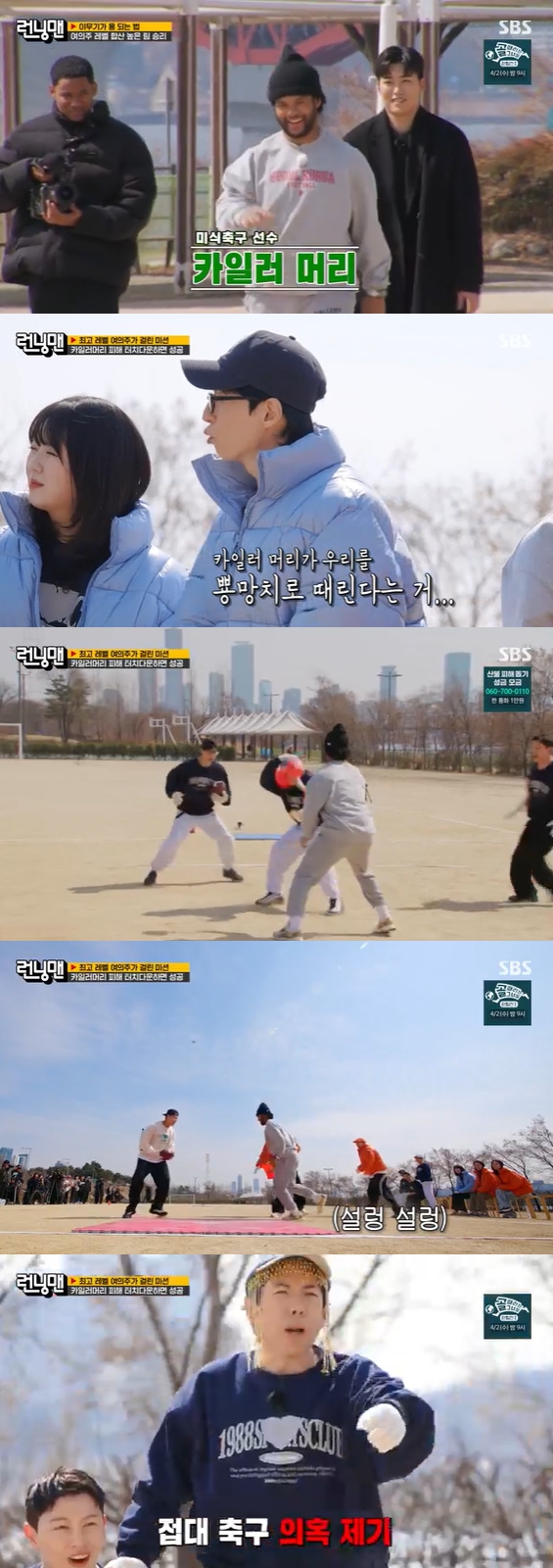 미션을 이어가던 카일러 머리는 김종국과 같은 팀의 지석진에게 "머리 아파요"라며 살벌한 경고를 날렸고, 곧바로 지석진을 잡아 연달아 뿅망치로 뇌 찜질을 시작했다.