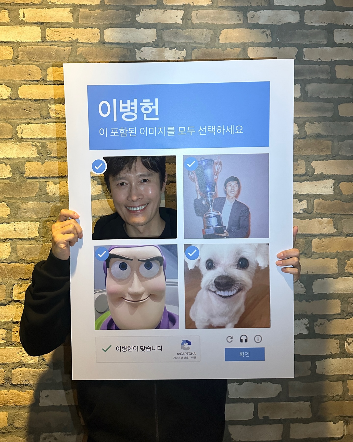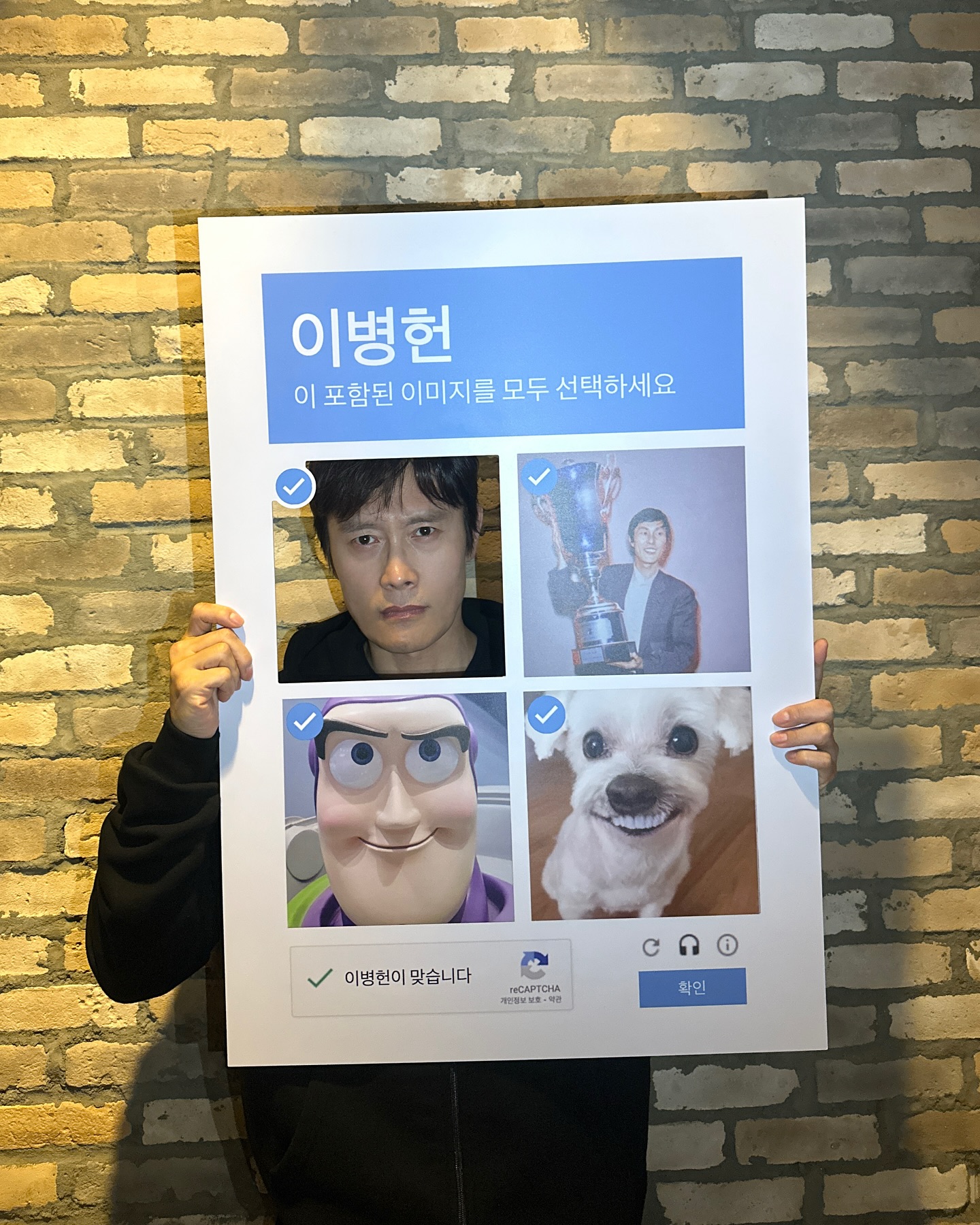 공개된 사진 속 이병헌은 '이병헌이 포함된 이미지를 모두 선택하세요'라는 문구가 적힌 판넬을 들고서 카메라를 응시하고 있다.