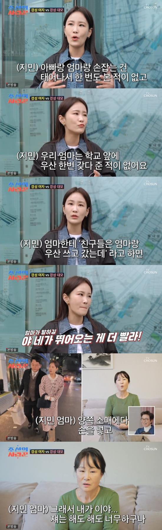 김지민은 "제가 경성 여자이지 않냐. 저희 엄마는 초경성 여자다. 아빠랑 엄마랑 손잡는 거 태어나서 한 번도 본 적 없고 뽀뽀하는 것도 본 적 없고 그 집에서 커서 제가 무뚝뚝하고 저는 엄마랑 손잡은 적 없다. 우리 엄마는 학교 앞에 우산 한번 갖다 준 적이 없는 분이다. '엄마 왜 우산 한번을 안 갖다 주냐. 친구들 엄마들 다 기다려서 우산 쓰고 갔는데' 그러면 '네가 뛰어오는 게 더 빨라' 그랬다. 그런 집안에서 커서 그런지 저랑 비슷하다고 보면 알 거 같다"라며 일화를 공개했다.