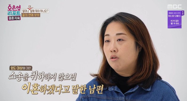 남편의 외도 상대와 만나 사실 여부를 확인한 후 사과를 받으려 했던 아내는 "터무니없게 이상한 말을 했다. 잘못을 인정하지 않고 사과를 안 하더라. 그래서 법적 대응으로 소송까지 하게 됐다"고 전했다.
