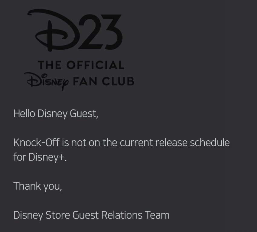 해당 글에 따르면 디즈니+는 문의한 고객들에게 "'넉오프'는 현재 디즈니+의 공개 라인업에 없다(Knock-Off is not on the current release schedule for Disney+)"는 내용의 메시지를 보냈다.