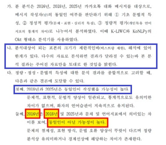 그러나 결과지 같은 페이지에는 "2018년과 2025년은 동일인이 작성했을 가능성이 높다", "문체적, 표현적, 문법적 양상이 일관되고, 통계적으로도 유의미한 차이가 없으며, 화자의 언어습관이 지속적으로 유지된다" 등의 결과 또한 써 있었다.