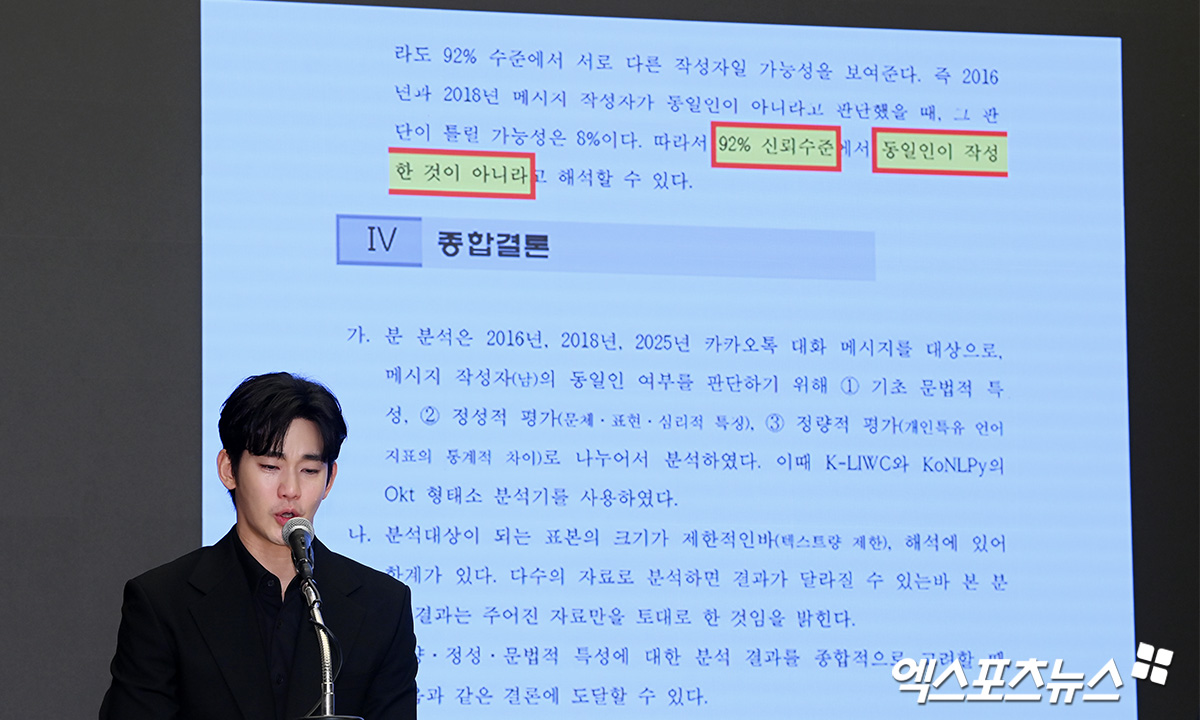 뿐만 아니라 '2018년과 2025년은 동일인이 작성했을 가능성이 높다. 문체적, 표현적, 문법적 양상이 일관되고, 통계적으로도 유의미한 차이가 없으며, 화자의 언어습관이 지속적으로 유지된다'는 내용도 있었다.