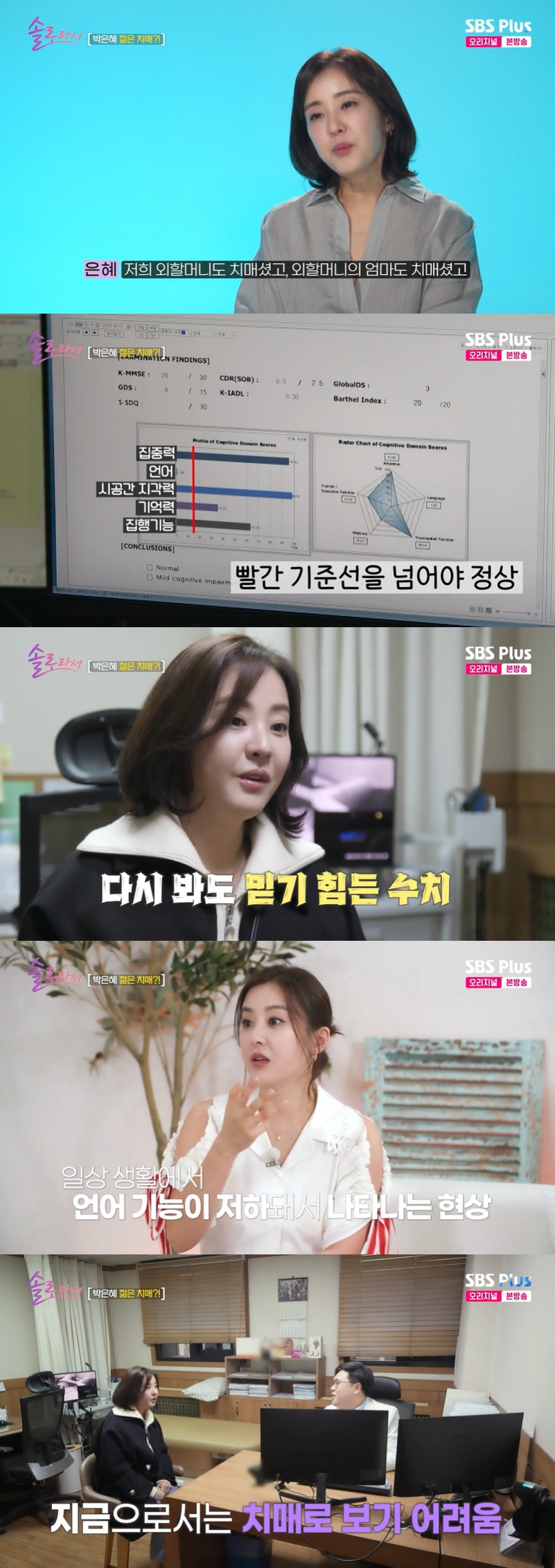 검사 후 의사가 "언어 기능 수치가 너무 낮다"고 하자 박은혜는 "아이들과 따로 살고 나서 그랬다. 말을 할 일이 없었다"며 믿기 힘들 정도로 낮은 언어 수치에 충격받은 모습을 보였다.