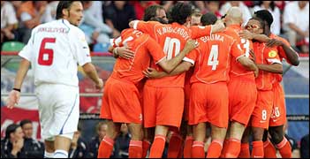 네덜란드는 반데사르 골키퍼, 4백에 반 브롱크호스트, 보우마, 스탐, 하이팅가를, 중앙미드필드에 필립 코쿠, 좌우에 다비즈와 세도르프를, 전방 좌우 날개에 로벤과 반데메이데, 중앙에 반니스텔루이를 포진시키는 공격적인 4-3-3 포메이션으로 경기초반부터 공세를 펼칩니다.