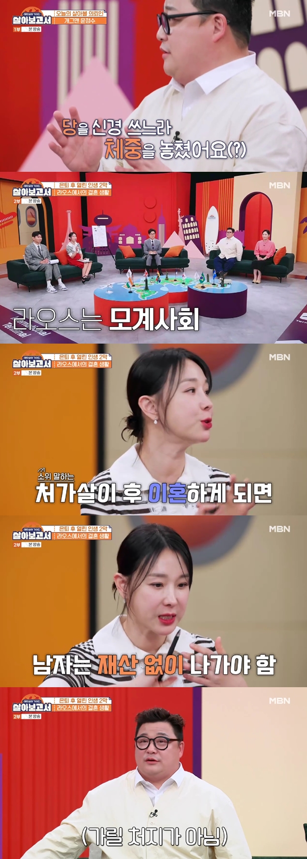 라오스살이 5년 차인 장만준은 "라오스는 모계사회로 여성들의 입김이 강하다"라고 설명했다. 이지혜는 라오스는 재산 승계 우선순위가 딸에게 있고, 결혼하면 처가살이 후 이혼하면 남자는 재산 없이 집을 나가야 한다고 설명했다.