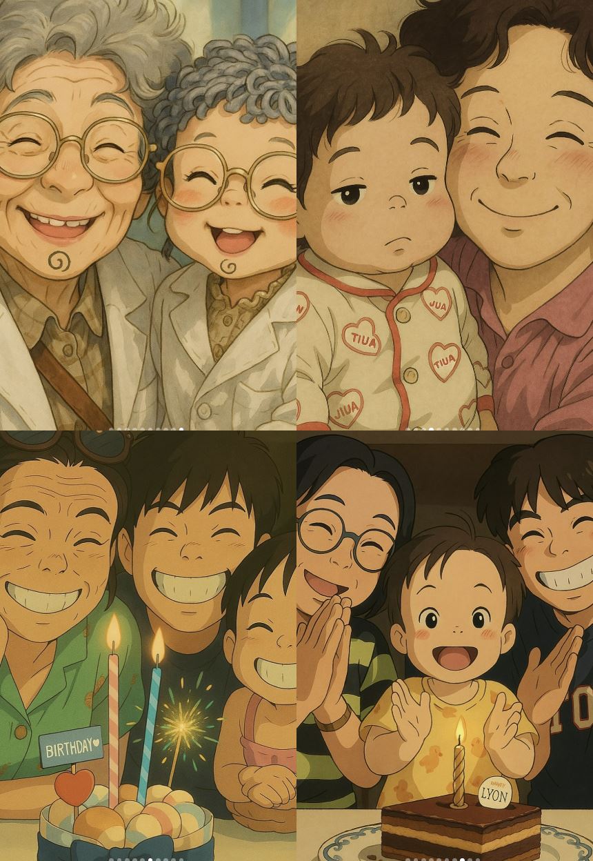 그는 "처음 사진은 아들과 손주랑 같이 찍었고, 두번째 사진은 황혼육아중인 사진이고, 세번째 사진은 할머니 생신 사진, 네번째 사진은 그나마 나은데 마지막 사진이 바로 증조 할머니를 만들어 버리네"라면서 "오늘 챗지피티를 내 휴대폰에서 지웠다...."고 덧붙여 웃음을 안겼다.